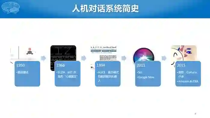 大家好,我叫车万翔,来自哈尔滨工业大学,今天很高兴和大家分享任务型对话系统的一些技术现状以及我们的一些研究进展。对话系统最早可以追述到图灵测试,后来并没有太大的进展,直到苹果公司的SIRI开始才有大规模的应用,之后谷歌、微软、百度等公司相继开发了各自的对话机器人。