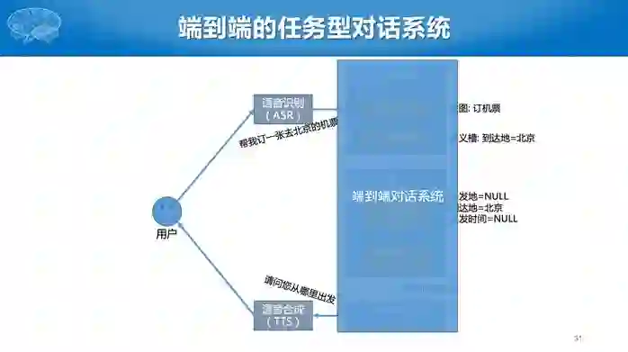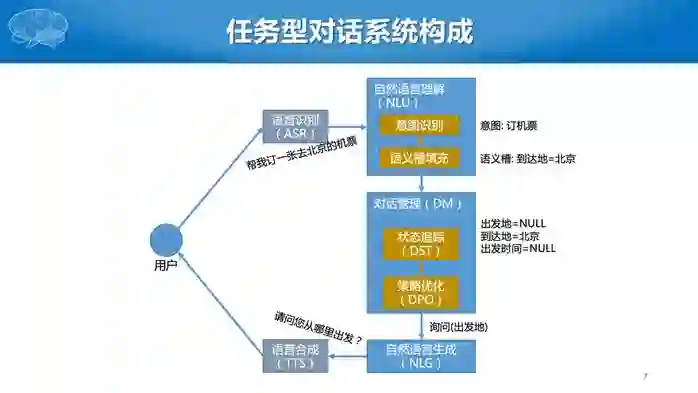 第三部分为自然语言生成。在对话系统里面语言生成工作相对比较简单,通过写模板即可实现。比如要询问出发地,就直接问“请问你从哪里出发”,然后经过 TTS 系统给用户反馈。整个过程可以一直循环下去,随着每次提问的不同,对话状态也随之变化,然后采用不一样的回复策略。