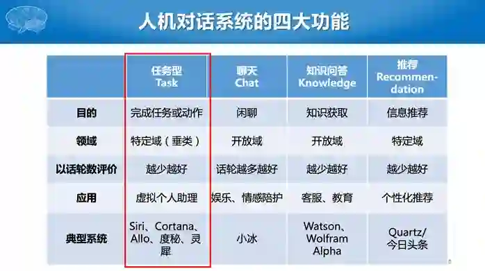我们将对话系统分成四个主要的功能:第一个是任务型对话系统,也可以认为其他都是非任务型对话系统,又可以进一步划分为聊天类、知识问答类,以及推荐类,这几个类型的机器人我们研究中心都在做。我今天主要介绍任务型的对话系统。