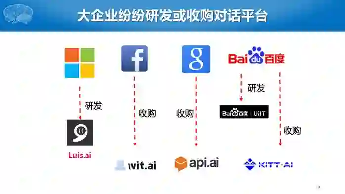 我们可以看到,用户即开发者如果想构建自己的对话系统,都需要这实现这三个模块,大大增加了开发的难度。有没有可能帮助用户,快速的构建自己的对话系统呢?用户只需要提供各自领域相关的数据,无需关注太多的技术细节。为此我们开发了对话技术平台。实际上,整个的产业界,包括微软、谷歌、脸书和百度等都在这做方面工作。如微软开发的LUIS系统,脸书收购的wit.ai,谷歌收购的api.ai,百度自研的UNIT以及收购的kitt.ai等等这些都在做对话平台。