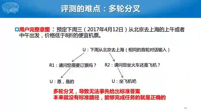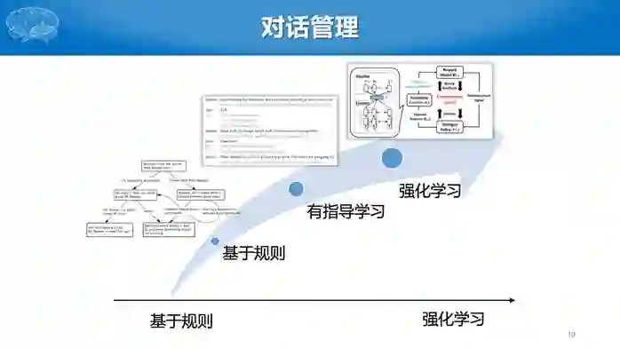 对话管理负责识别出下一步采用什么动作。这个问题比较麻烦就是我们很难标注出数据,告诉对话系统每一步采用什么动作,因为很多时候没有标准答案。比如刚才那个例子,询问出发时间还是出发地都是合理的动作,只有对话全流程结束后才知道该步骤采取的动作是否合适。这是强化学习擅长解决的问题。早期对话管理的研究往往采用基于规则的方法,后来出现基于有指导,即标注每一步所谓的标准动作,目前研究主要集中在基于强化学习的方法,其中的奖励可以是对话轮数、任务完成情况等。