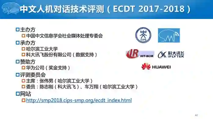 与其它自然语言处理问题不同,对话系统的评价也是一个非常难的问题。对于用户输入的对话,系统可以有各种各样合理的回答。为此,我们去年和今年,在全国SMP(社会媒体处理)大会上,连续两年组织了人机对话技术评测,评测相关的具体信息如下。
