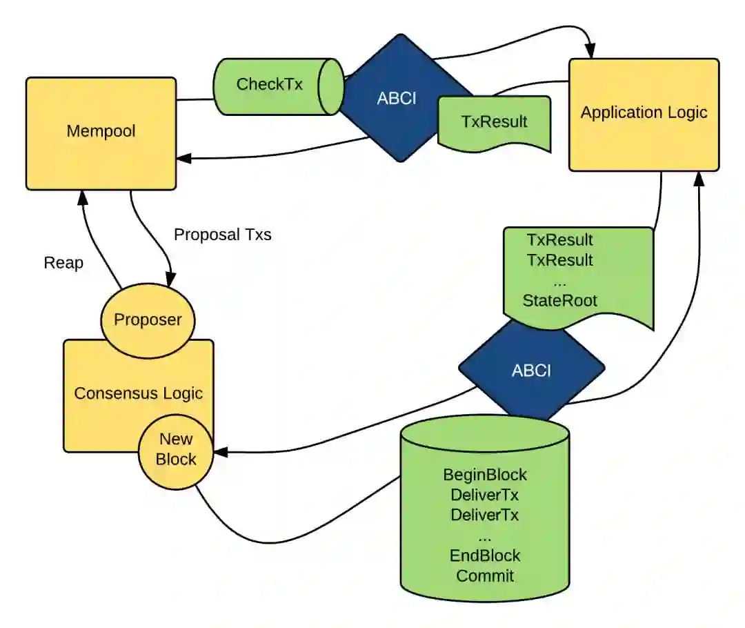 放到 mempool 里的 TX 会被定期广播到所有节点。当 Tendermint 选出了 Proposal 节点后,它便会从 mempool 里选出一系列的 TXs,将它们组成一个 Block,广播给所有的节点。节点在收到 Block 后,会对 Block 里的所有 TX 执行 DeliverTX 操作,同时对 Block 执行 Commit 操作。