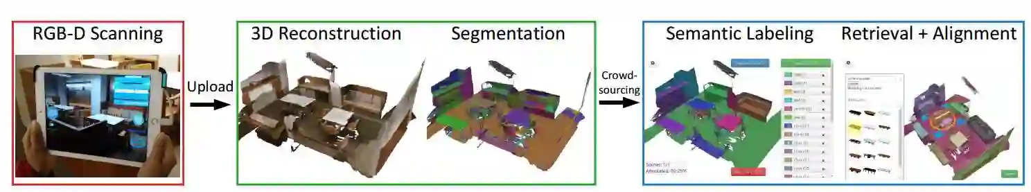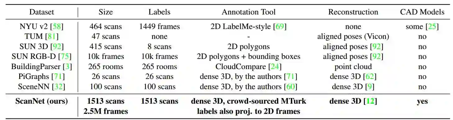 为了解决这一问题,我们引入了一个RGB-D视频数据集ScanNet。ScanNet包含1513个场景中的2.5M张图片。与此同时ScanNet还提供了相机位姿,平面重建和语义分割的标注。为了获得这些数据,我们设计了一个易于使用的RGB-D采集系统来进行平面重建和语义分割标注的工作。