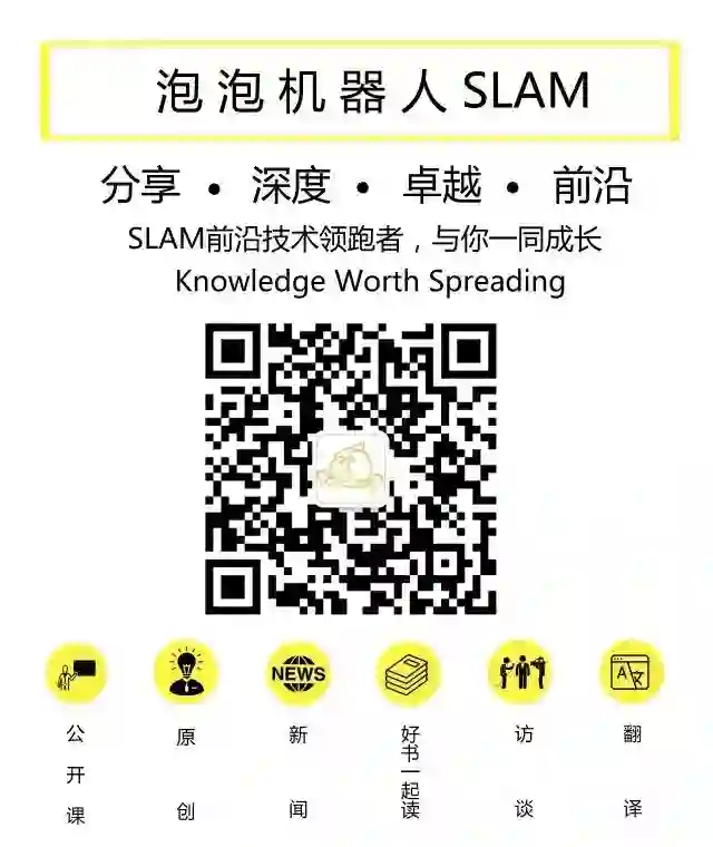 泡泡机器人SLAM的原创内容均由泡泡机器人的成员花费大量心血制作而成,希望大家珍惜我们的劳动成果,转载请务必注明出自【泡泡机器人SLAM】微信公众号,否则侵权必究!同时,我们也欢迎各位转载到自己的朋友圈,让更多的人能进入到SLAM这个领域中,让我们共同为推进中国的SLAM事业而努力!