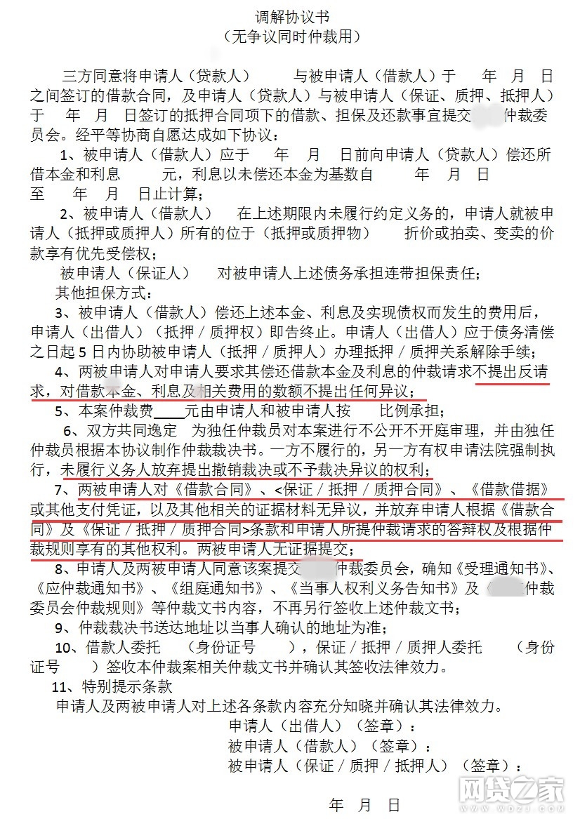 据网贷之家获取的材料,“先予仲裁”协议往往约定:出现纠纷被申请人放弃一切质证,或答辩,或管辖权异议,或仲裁员回避等权利。