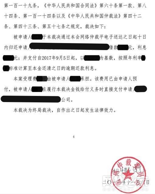 需要特别注意的是,互联网仲裁作出的裁决书效力等同法院判决书,在借款人不履行生效裁决书时,申请执行人可凭该生效裁决书及其它法院规定的材料向被执行人住所地或者被执行的财产所在地的中级人民法院申请强制执行。