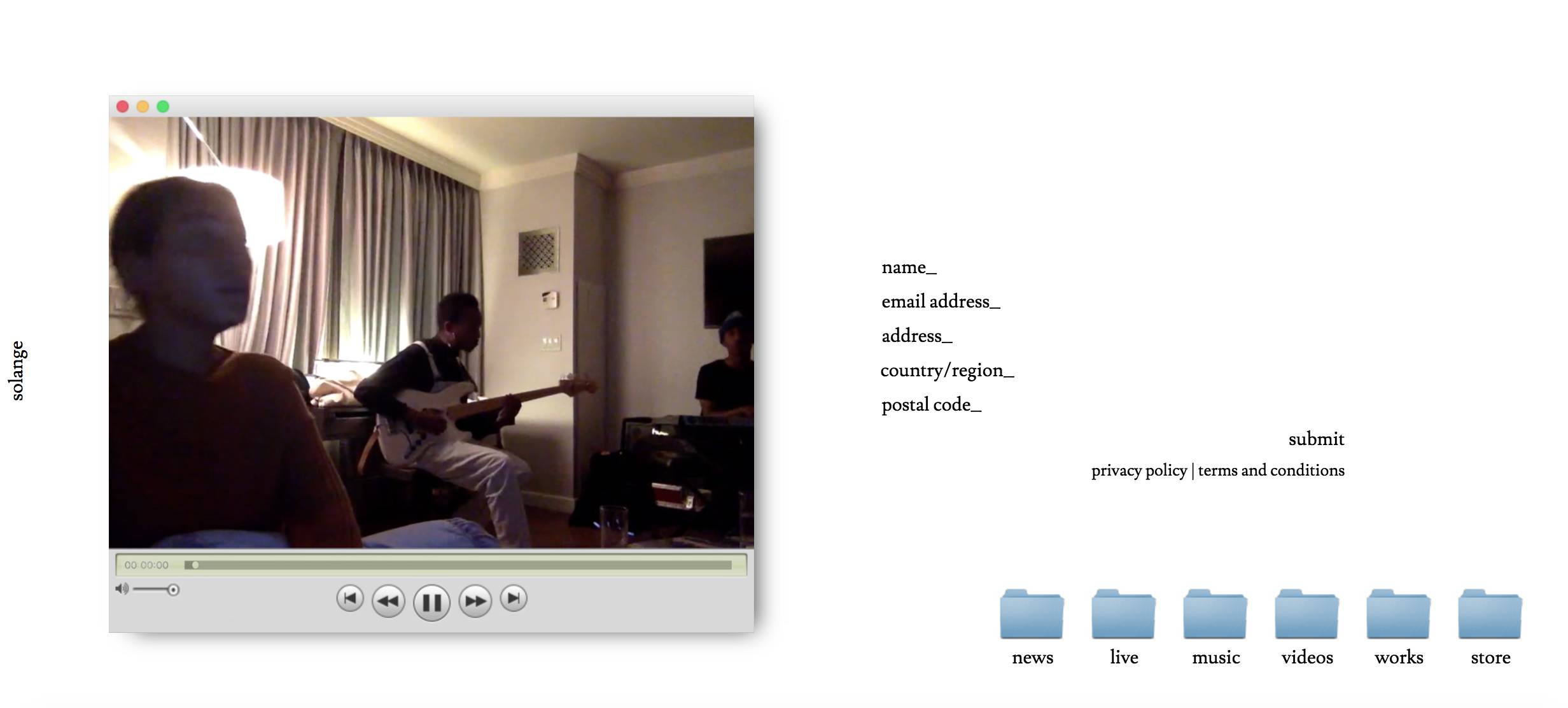碧昂斯的妹妹 Solange 的 D.I.Y.主页走的是 iMac 的桌面风格,配有 QuickTime 窗口和蓝色文件夹。