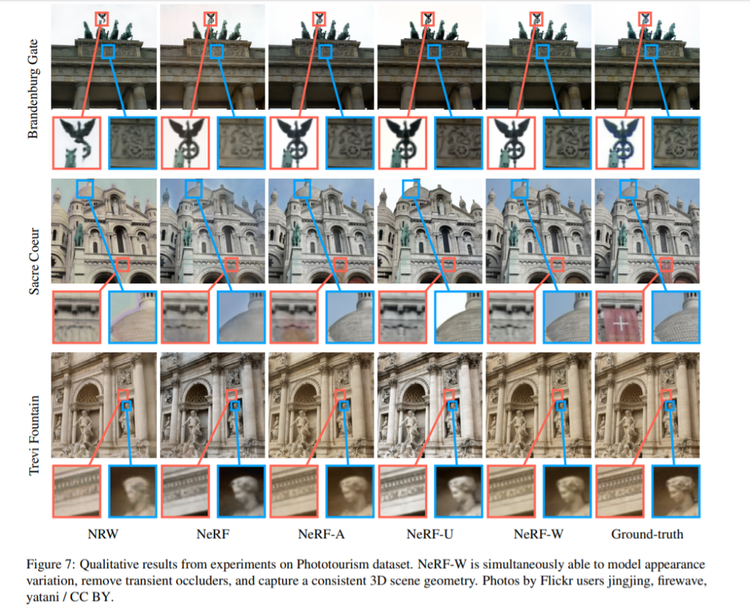 谷歌的团队也看到了这种缺陷,并在最近的一项研究中推出了 NeRF 模型的改进版——NeRF in the Wild(NeRF-W),使其更加适用于充满光线变化、遮挡的户外环境。