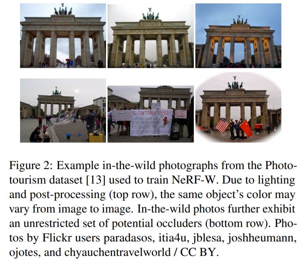 NeRF 假设世界在几何、物质和光度学上是静态的,即世界的密度和辐射(radiance)都是恒定的。因此,NeRF 要求在相同位置和方向拍摄的任何两张照片必须具有相同的像素强度。