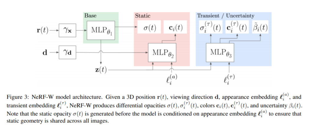 研究者提出了两个模型组件来解决这些问题。下图 3 展示了 NeRF-W 的模型架构。