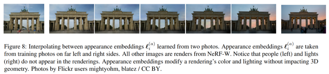 NeRF-W 捕捉了低维潜在嵌入空间中的光线和光度后处理。在两个嵌入之间进行插值,可以平滑地捕获外观的变化,而不影响 3D 几何形状。