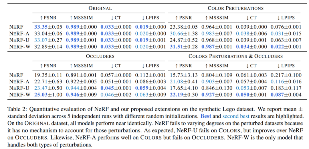第二项评估是在合成的乐高数据集上完成的。研究者引入了两类扰动(着色和遮挡)来模拟室外环境可能带来的挑战:光照变化和瞬时目标。
