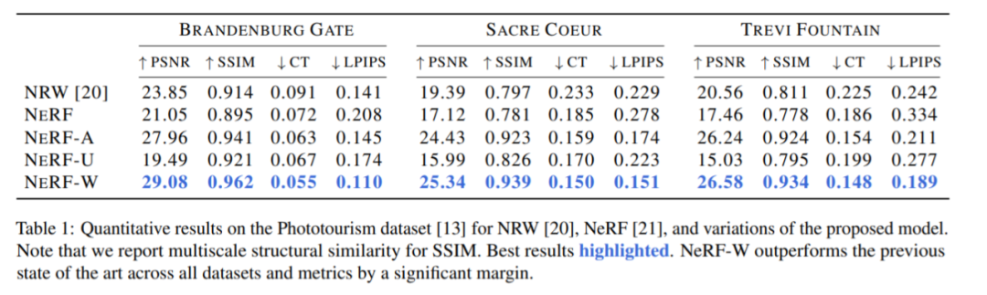 目前,研究者已将 NeRF-W 应用于几个具有挑战性的自然文化地标照片集,这些生成的效果图在各项指标上均实现了新的 SOTA。
