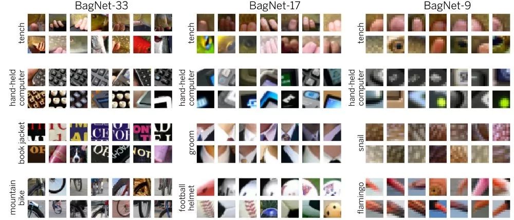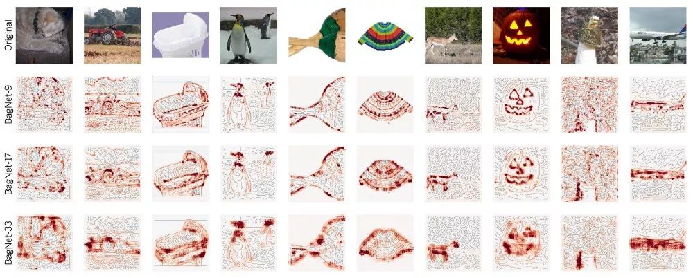 在所有四个实验中,我们发现CNN和BagNets之间的行为非常相似。 例如,在上一个实验中,我们展示了BagNets最敏感的那些图像部分(例如,如果你遮挡那些部分)与CNN最敏感的那些基本相同。