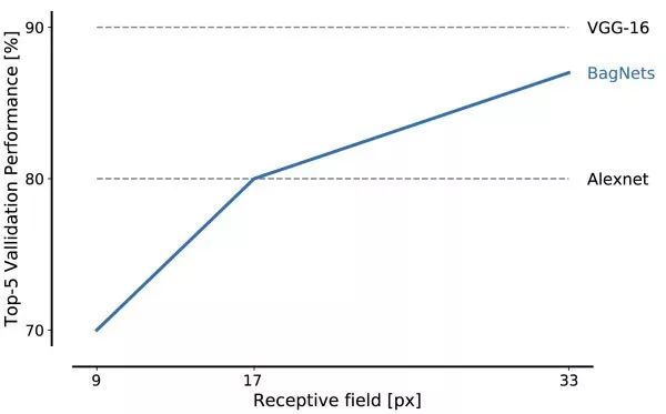 即使对于非常小的贴片尺寸,BagNet上的BagNets性能也令人印象深刻:尺寸为17 x 17像素的图像特征足以达到AlexNet级别的性能,而尺寸为33 x 33像素的特征足以达到约87%的前5精度。通过更仔细地放置3 x 3卷积和额外的超参数调整,可以实现更高的性能值。