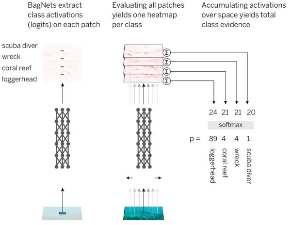 来自BagNets的热图显示了确切的图像部分对决策的贡献。 热图不是近似的,而是显示每个图像部分的真实贡献。