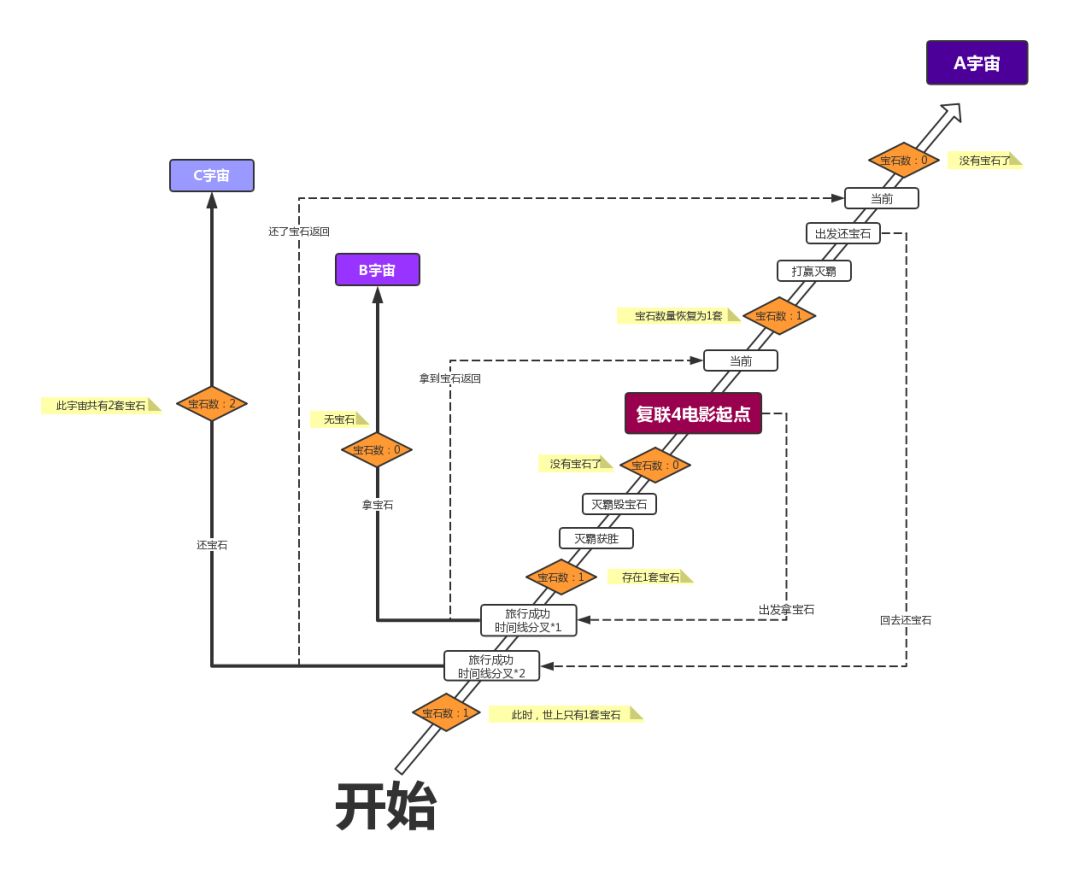 因为回到过去会开启新的时间线,所以世界A里复联的时间旅行创造出了世界B,并从B借走了宝石,带着宝石回到世界A。