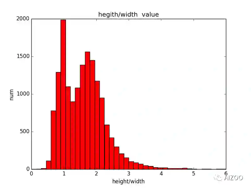 训练目标检测模型,最重要的合理的设置anchor的大小和宽高比,笔者个人在做项目时,一般会统计数据集的目标物体的宽高比和大小来设置anchor的大小和宽高比。例如,在我们标注的口罩人脸数据集上,我们读取了所有人脸的标注信息,并计算每个人脸高度与宽度的比值,统计得到高度与宽比的分布直方图,如下: