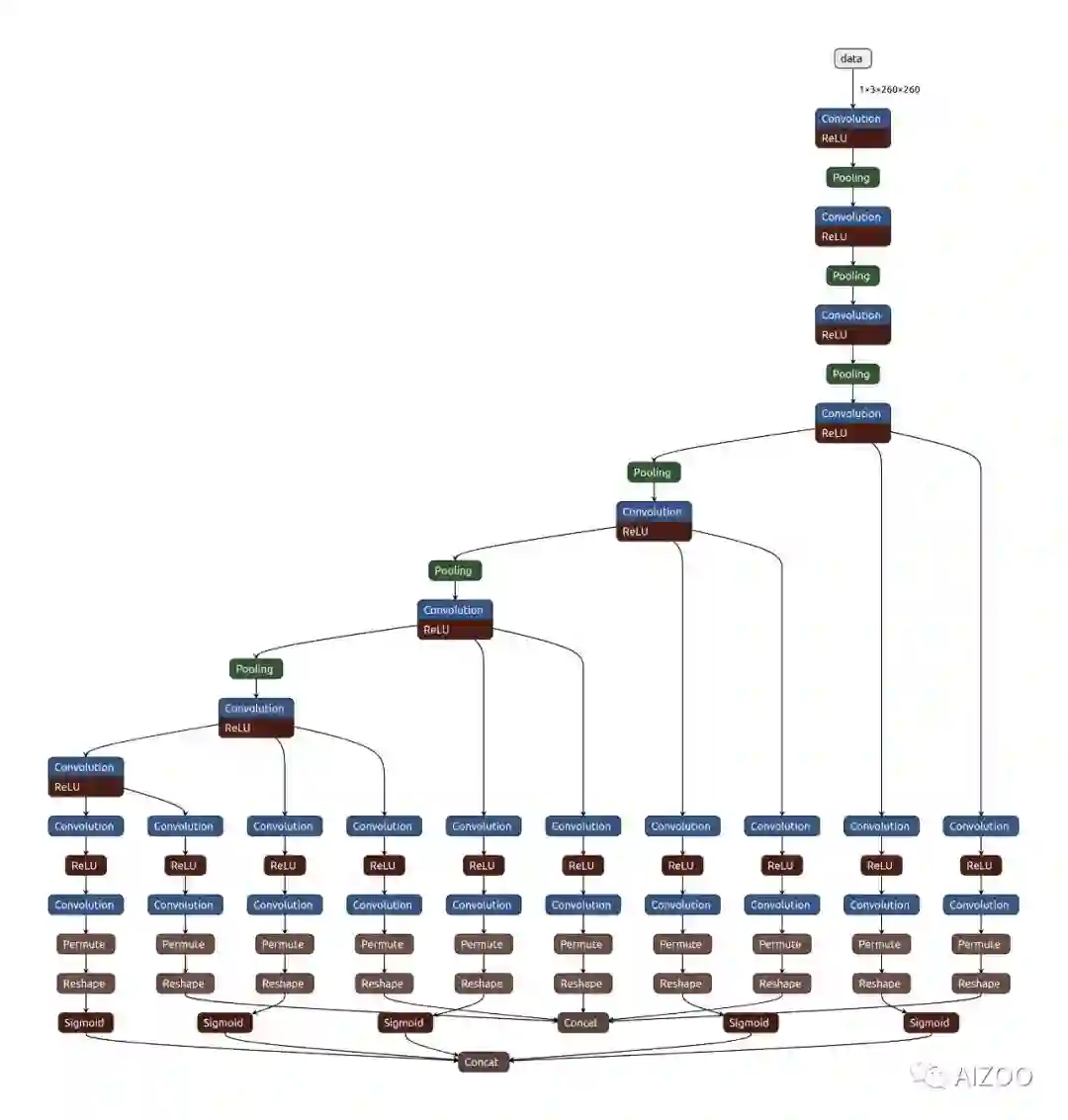 我们开源的模型是一个非常小的模型,输入是260x260大小,主干网络只有8层,有五个定位和分类层,一共只有28个卷积层。而每个卷积层的通道数,是32、64、128这三种,所有这个模型总的参数量只有101.5万个参数。下图是网络的结构图。