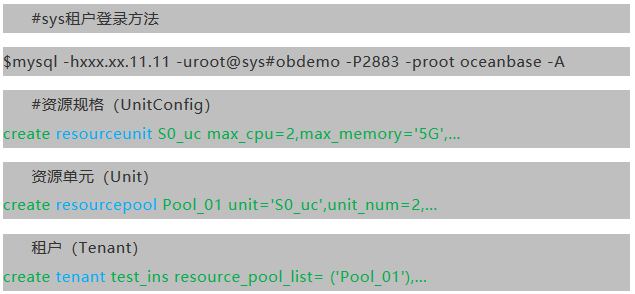 OceanBase定义了一些基本的资源规格(Resource unit config,如4CPU8Gmem500Gdisk等),然后选取某类资源规格创建一组资源池(Resource Pool),此时集群资源就有一部分被分配出去了。最后将这个资源池关联到一个新建租户,则租户就可以使用这个资源池的能力。