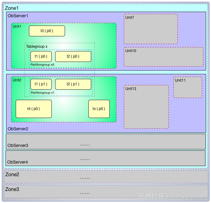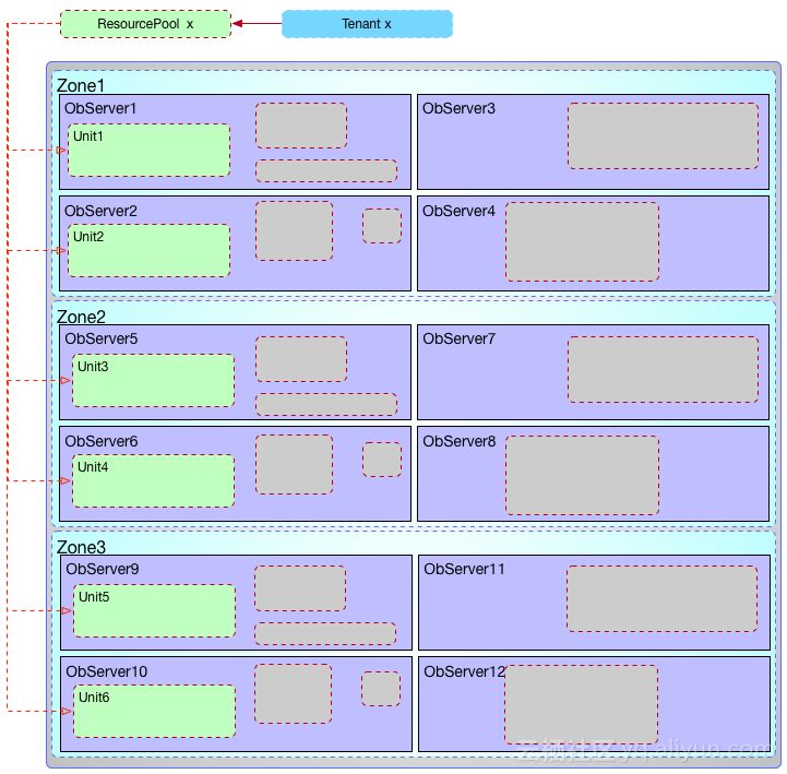 资源池(Resource Pool)是由一组资源单元(Resource Unit)组成。资源单元数量默认跟Zone的数量一致或者是它的倍数(可以配置具体分布在哪些Zone以及每个Zone里的Unit数量)。如下图