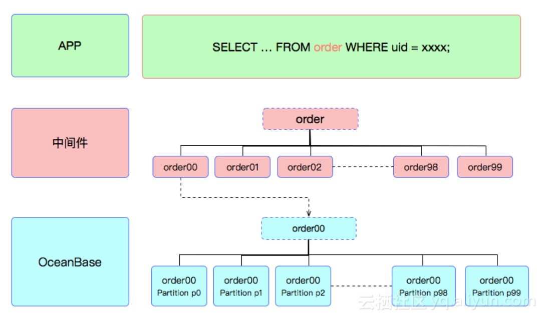 上图是分库分表和分区表同时结合使用。业务表order先经过中间件拆分为100个分表(存在10个分库里),每个分表在OceanBase内部又是一个分区表(100个分区)。分库分表的维度和分区表分区的维度都是一致的,根据用户ID。