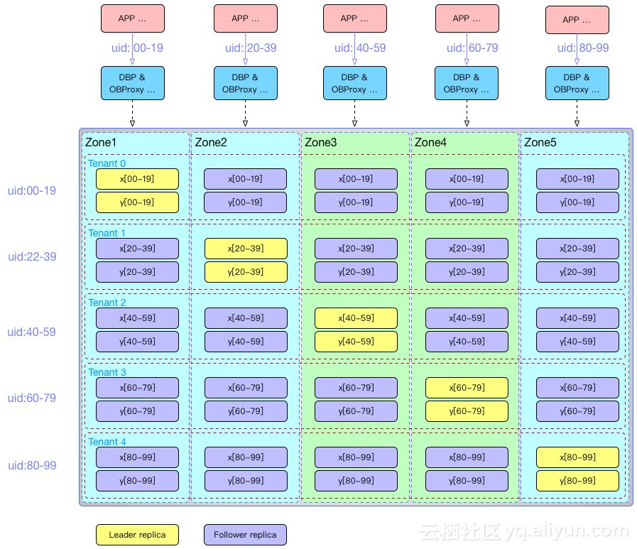 首先业务架构层面能根据用户ID(uid)做拆分,将用户拆分为100分。x和y是用户直接相关的表,都根据uid拆分为100个分表,分布在5个不同的租户里。x[00-19]表示20个分表。每个租户的Leader分别分布在不同的Zone。uid:00-19表示 分到这20个分片的用户数据和用户流量。