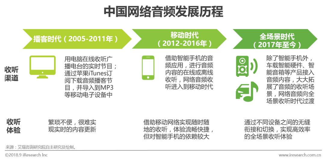 根据收听渠道和载体,可以把中国网络音频的发展历程分为播客时代(2005-2011年)、移动时代(2012-2016年)和全场景时代(2017年至今)三个时期,目前中国网络音频行业正由移动时代迈入到全场景发展时代的初期,以车载智能硬件、智能音箱等为代表的智能联网产品进一步提升了网络音频在细分场景下的收听体验。