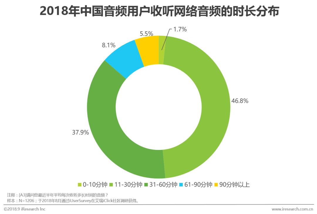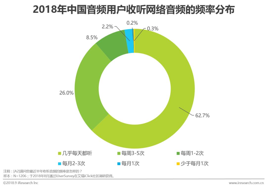 用户收听频率高,粘性强:62.7%的用户会每天收听音频内容,即超过6成的音频用户是日活跃用户。