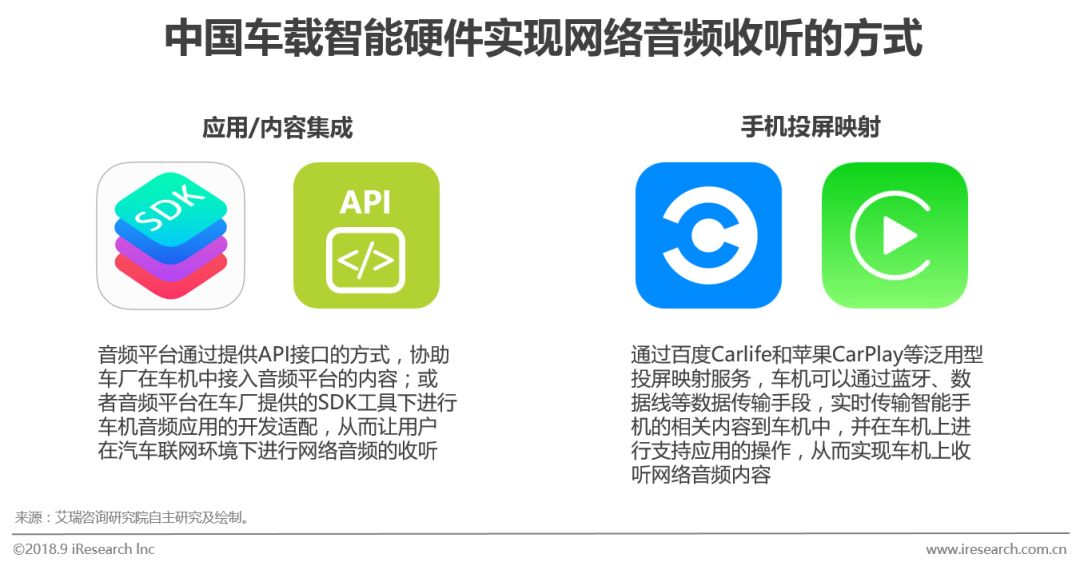 随着车联网概念的兴起与实践,汽车中控系统(车机)的地位进一步凸显,并成为车载智能硬件的重要代表,而车机通过应用(SDK+API)预装、投屏映射服务等方式,实现车载场景下网络音频的收听,加上其对语音交互操作的支持和优化,有效避免了行车场景下触控操作带来的安全隐患,从而推动了网络音频车载收听场景的发展。