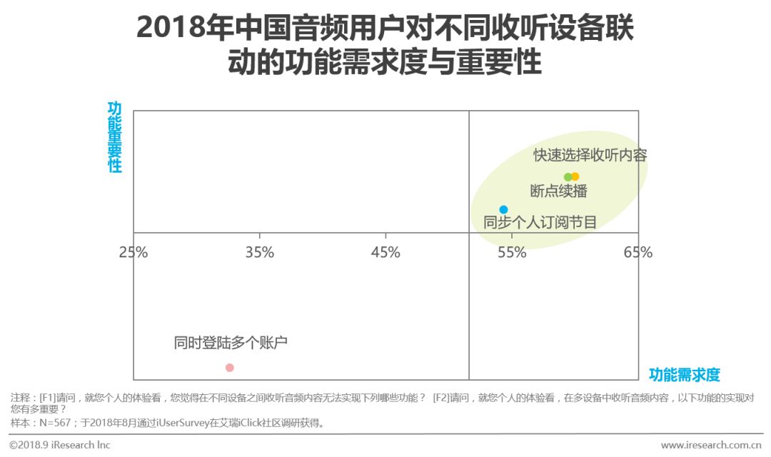 但就目前音频市场来说,上述功能还不能完全实现。艾瑞认为音频全场景实现的支柱是以用户为单位,实现收听设备的多样化以及不同设备交互使用的便利化,因此满足上述用户需求是音频全场景发展的关键。