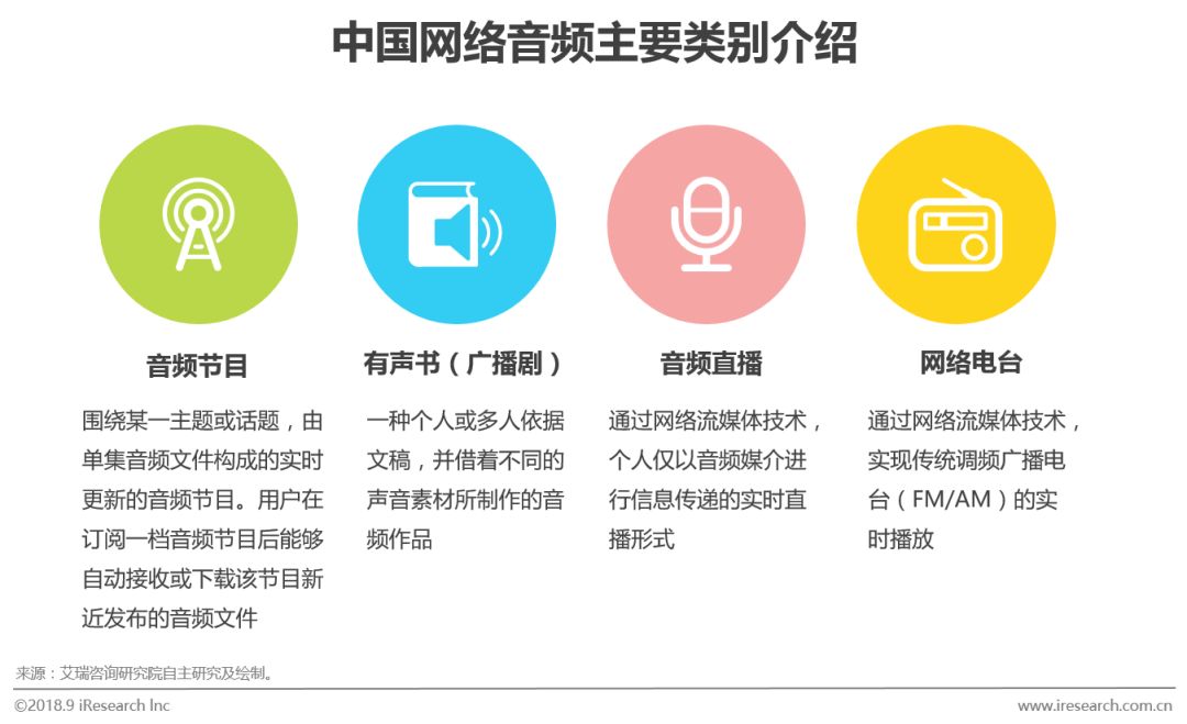 狭义的网络音频:由于完整的数字音乐专辑或音乐流媒体服务涉及到唱片公司复杂的版权交易,且数字音乐已经形成较为独立的产业体系,因此数字音乐不归为狭义的网络音频。目前国内网络音频主要包括音频节目(播客)、有声书(广播剧)、音频直播以及网络电台等实现形式。本报告的研究范畴是狭义的网络音频。