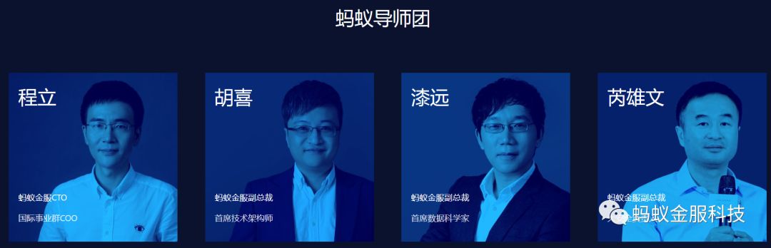 不光“长老团”阵容强大,蚂蚁金服的“导师团”也丝毫不逊色:蚂蚁金服CTO兼国际事业群COO程立、蚂蚁金服副总裁兼首席技术架构师胡喜、蚂蚁金服副总裁兼首席数据科学家漆远、蚂蚁金服副总裁兼大安全负责人芮雄文,也都坐镇ATEC开发者大赛。