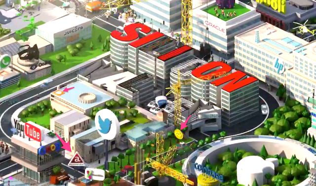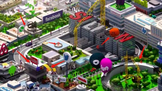 随后,我们的注意力被苹果的圆形办公楼吸引过去,去年的它出现时还只是一个脚手架—— 苹果的新办公址在去年四月正式启用,并见证了iPhone十周年的里程碑 ;边缘化的公司雅虎彻底不见了,被合并到了OTHA; Uber楼顶的人都在通过消防便梯逃向隔壁的Lyft,同时Uber的大楼似乎有个破洞正在塌陷,这当然是在暗示Uber在2017噩耗连连, 创始人被逼上梁山做起了房地产商,但好像2018年它也没有时来运转, 第一桩无人车撞死行人案就落到它的头上。