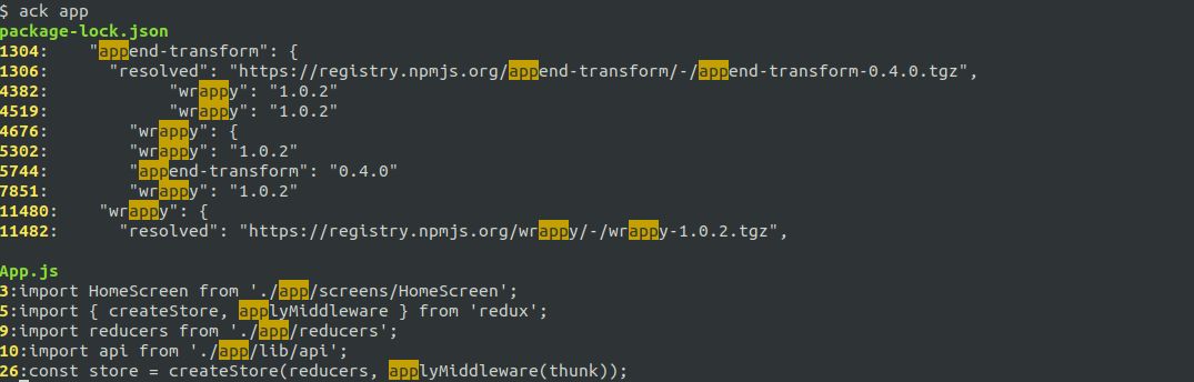 ack和ag是两个文本搜索工具,比自带的grep要好用得多。在指定目录下搜索文本时,它们不需要像grep那样指定各种命令行选项,输出结果也会包含文件名和行号,并且会高亮显示搜索关键字。