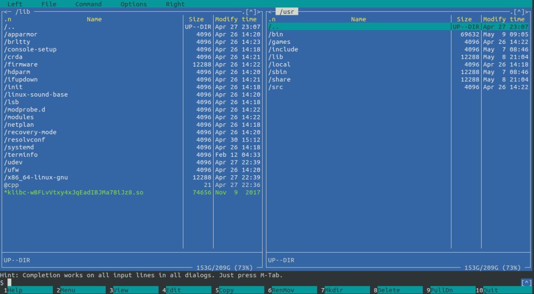 mc的全称是GNU Midnight Commander,是个命令行下非常好用的文件管理器。它采用左右两个窗口的形式管理文件,并且还支持FTP和SFTP。当你需要操作许多文件却又无法访问GUI时,比如在远程服务器上,那么mc是最好的选择。