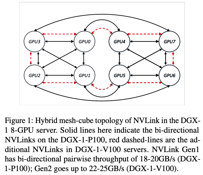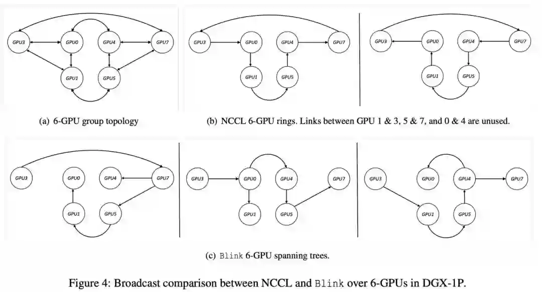 如上三点 网络异构性,导致了 NCCL/Horovod 在优化 GPU 间数据聚合的过程中,无法充分利用所有的同构 / 异构通信线路。如图 2(b)所示,当 GPU1 和 GPU4 之前没有 NVLink 直接相连的情况下,NCCL/Horovod 因为无法在 GPU0,GPU1,GPU4 之间构建环状通道,所以无法利用高速通信线路 NVLink,于是只能用低速的 PCIe 做为数据聚合的通道。然而,即使在 NCCL/Horovod 能够构建环状通信通道的情况下,NVLink 还是有可能没有被充分利用(例如图 4 所示,4(b)中,GPU1 和 3,5 和 7,0 和 4 之间的 NVLink 未被利用)。