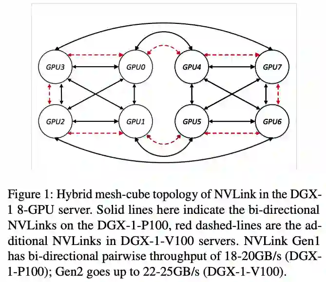 为了解决 GPU 间数据通信的瓶颈,在硬件上,GPU 生产厂商 Nvidia,针对顶级单机多卡的机器(例如 DGX-1, DGX-2)发布了点对点的高速 GPU 间数据传输通道 NVLink(文献【6】)和 NVSwitch(文献【7】),单条 NVLink 的通信带宽是传统 PCIe 总线的 2-3 倍。多机间通信通过增设多个 InfiniBand/Ethernet 端口从而可以实现多端口并行传输提高网络吞吐率。在软件上,例如 Uber 的 Horovod(文献【3】),Nvidia 的 NCCL(文献【2】),百度的 Ring-AllReduce(文献【4】),都是专门针对单机内 GPU,以及多机器间 GPU 通信所进行的系统层面优化的库函数和机器学习平台。