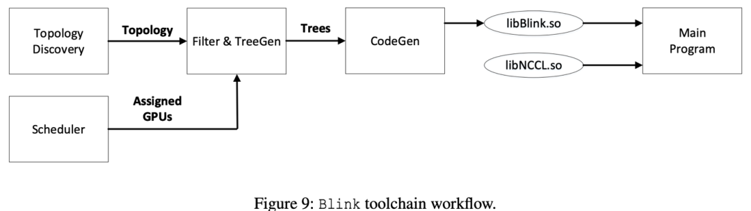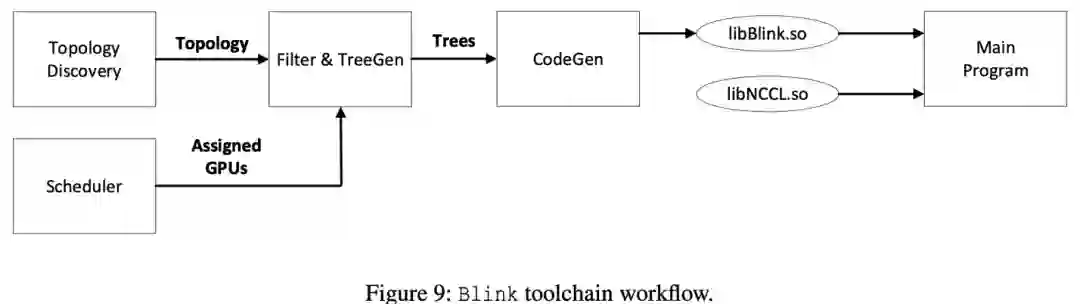 基于如上问题,本文提出 Blink,一个最优的 GPU 间数据聚合的通信库。首先,对于由于机器版本不同,或被分配在单个机器内的 GPU 间任意拓扑结构的情况,Blink 打破了传统的 GPU 间环状(ring)通信通道的构建协议,提出了使用生成树(spanning tree)的通信通道构建协议。相比于环状通信通道,生成树通信通道可以更好的利用所有的网络链接线路(例如:图 2(b),4(c)所示)。其次,针对异构通信线路(如 NVLink 和 PCIe),Blink 可以根据线路的带宽不同,调整在其上传输数据的比例划分,从而充分利用异构通信线路(例如图 2(a))。最后,Blink 提供了与 NCCL 一致的 API,所以可以直接无缝应用于流行的机器学习平台上,如 TensorFlow、Pytorch 等。