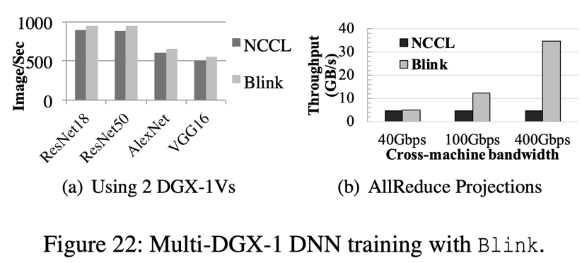 如图 22 所示,在多机,即 2 个 DGX-1 之间,相比于 NCCL/Horovod,Blink 可以提高 11% 的模型训练效率(图 22(a))。Blink 效率提升小的原因在于,当下云环境的多机间通信仍用 40Gbps 的低速 Ethernet。目前 AWS 和其他运营商(文献【5】)都在逐步改进多机间的网络通信带宽。针对可能达到的多机通信带宽,我们做了模拟器仿真,仿真结果如 22(b)所示,相比 NCCL/Horovod, Blink 可以提升多机器的 GPU 间数据聚合效率高达 7 倍。