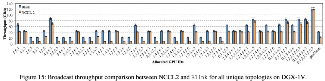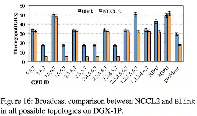 在 DGX-1-P100 的机器上,相比于 NCCL,Blink 的 broadcast 提高吞吐率(图 16)高达 3 倍(平均提升 1.6 倍)
