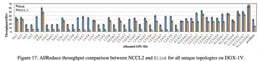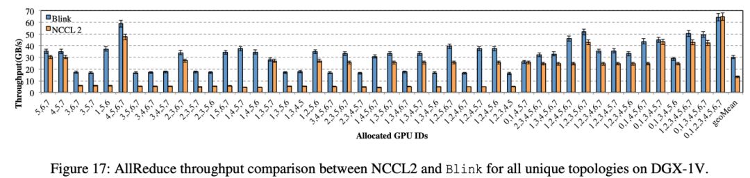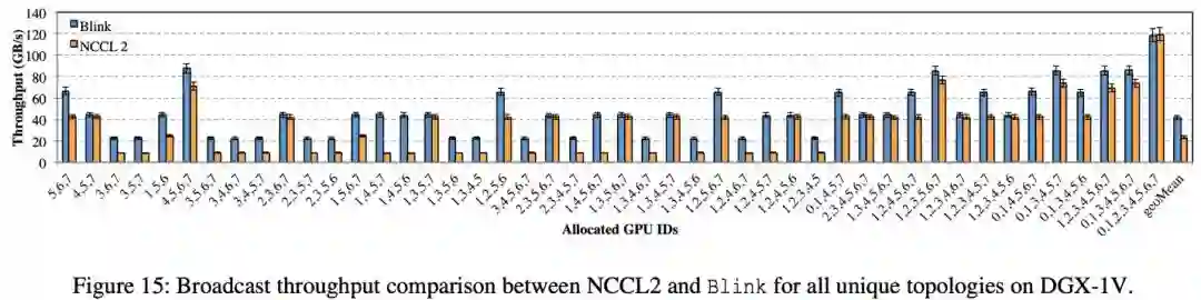 在 DGX-1-V100 上进行的 Broadcast 和 AllReduce 实验中,相比于 NCCL,Blink 的 broadcast 吞吐率(图 15)提升高达 6 倍(平均提升 2 倍),Blink 的 AllReduce 吞吐率(图 17)提升高达 8 倍(平均提升 2 倍)