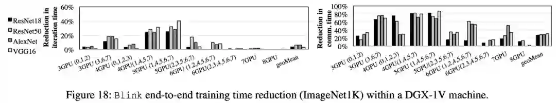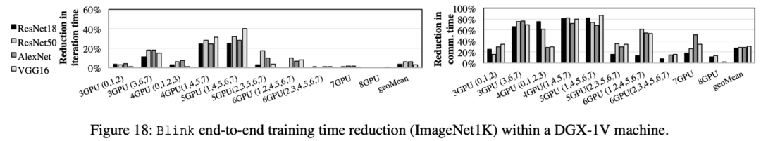 如图 18 所示,在单机 DGX-1 上,相比于 NCCL/Horovod,Blink 可以缩短 GPU 间数据聚合时间高达 87%,从而缩短模型训练总时间高达 40%。