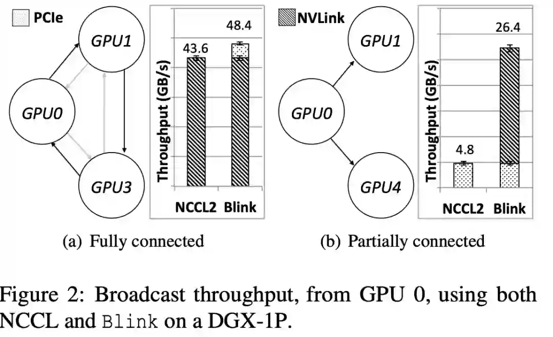 当前的软件通信协议,并没有充分利用异构的 GPU 间通信通道(例如,NVLink 和 PCIe)。其根本原因是,现有通信协议使用的是在软件层面,建立多个环状通信通道。在一个环状通信通道里,整个环的带宽会被带宽最小的链接所限制。试想如果在一个由 NVLink 组建的多 GPU 的环状通信通道中,有一段链接是 PCIe,则整个这个环状通信通道的带宽会被限制在了 PCIe 的带宽上(因为 PCIe 带宽远小于 NVLink)。所以当下数据聚合的软件通信协议(NCCL/Horovod)就只用同构的高速传输线路(NVLink),而忽略其他低速,异构的传输线路(PCIe)(如下图 2(a)所示)
