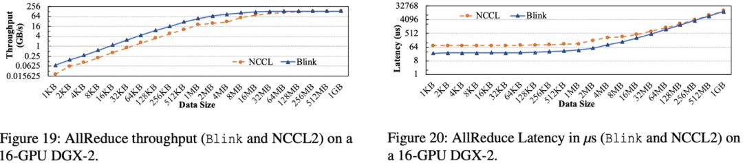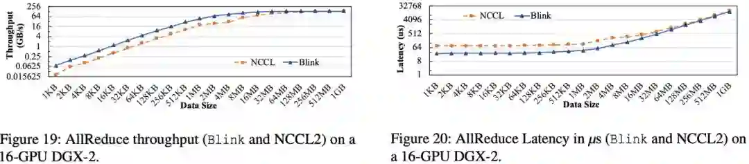 在 DGX-2 的 16-GPU 机器上,相比于 NCCL,Blink 的 AllReduce 提高吞吐率高达 3.5 倍(图 19),减小通信延时 3.32 倍(图 20)。