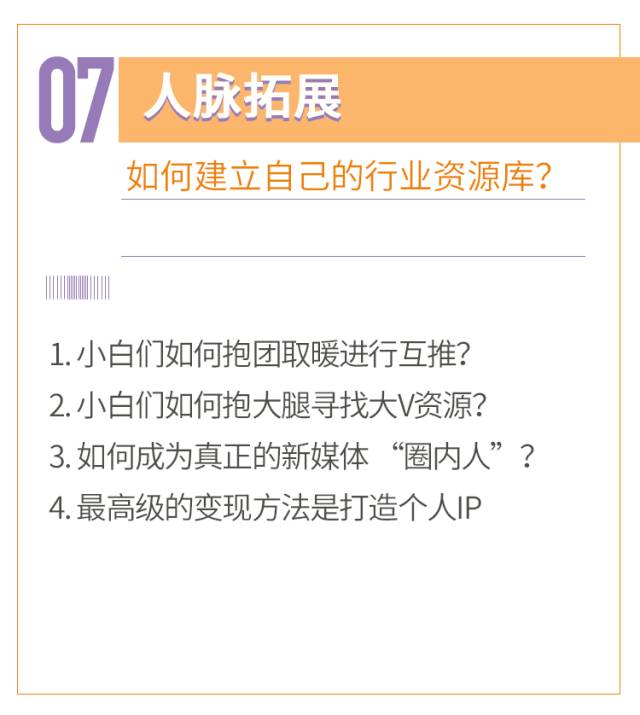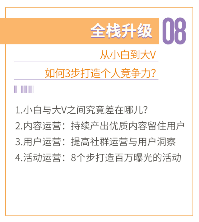 我把这些经验和方法,按照专业的课程研发方式,梳理成了8个板块,共40个大的知识点,包含了一个人从小白到大V需要掌握的所有技能。