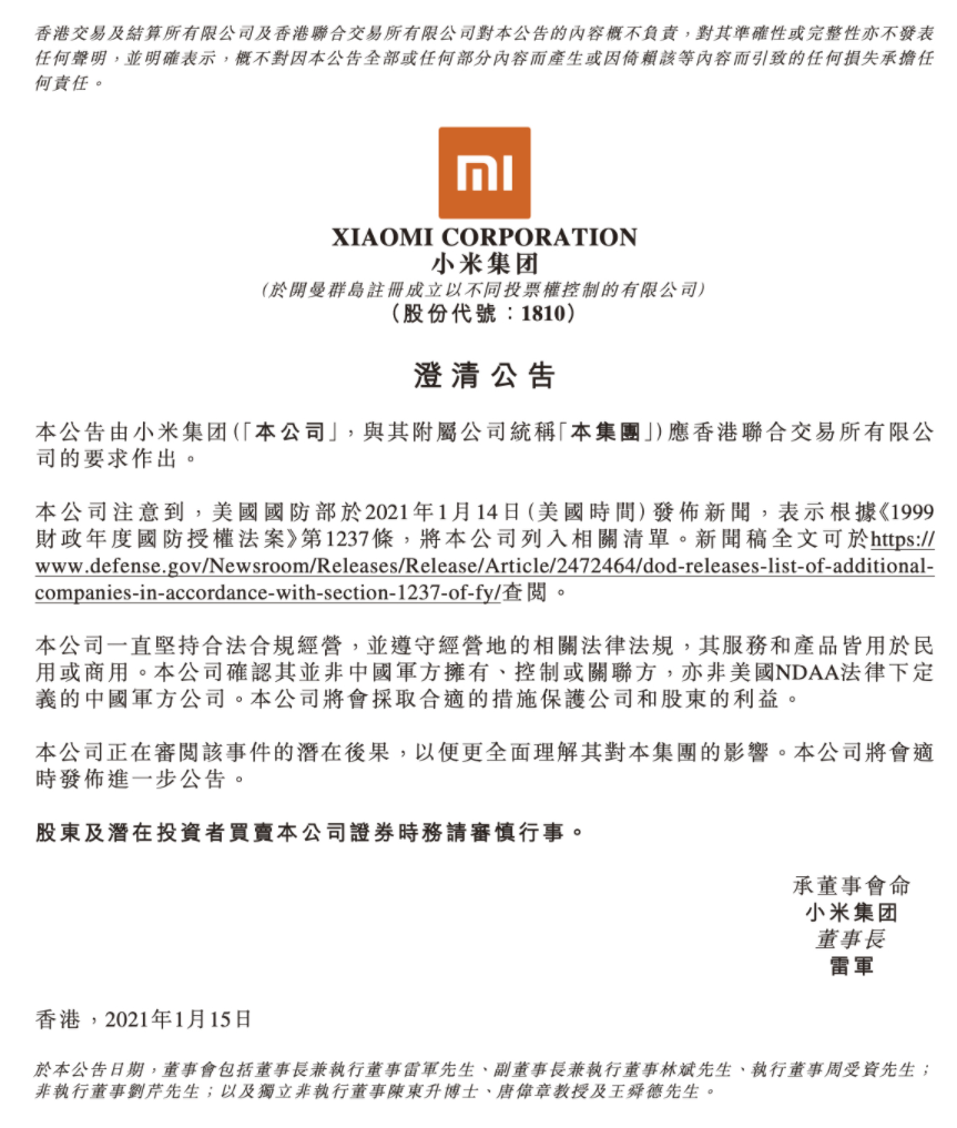 在特朗普政府任期最后一周,美国国防部将小米这家电子企业列入到了「涉军」黑名单中。