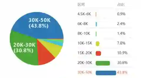 同时,薪资差距较大,20%的工程师可以达到40K以上(年薪50万+),同时仍有20%的工程师在20K以下(年薪20万左右),差距在一倍以上。