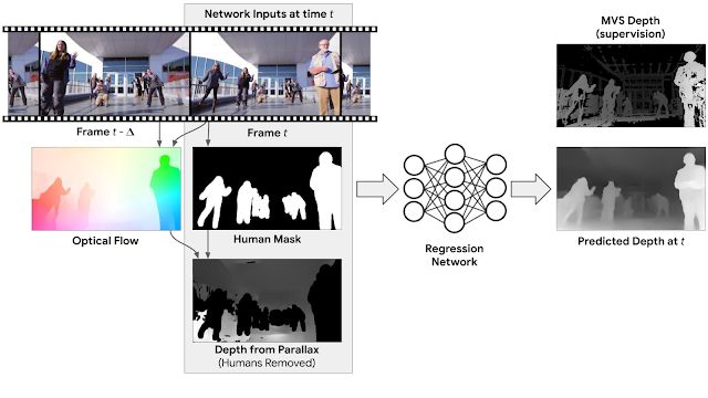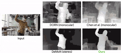 值得指出的是,用机器学习的方法「学习」三维重建/深度预测并不是什么新鲜事,不过谷歌的这项研究专门针对的是摄像头和被摄物体都在移动的场景,而且重点关注的被摄物体是人物,毕竟人物的深度估计可以在 AR、三维视频特效中都派上用场。